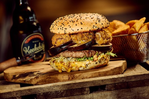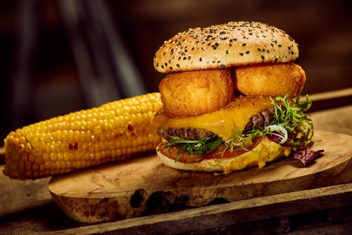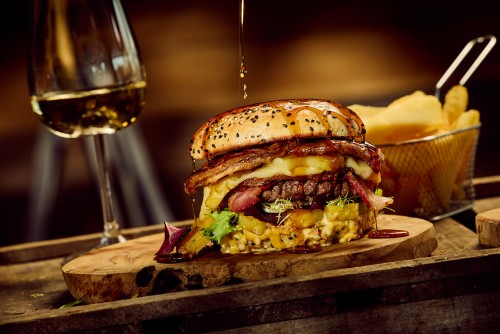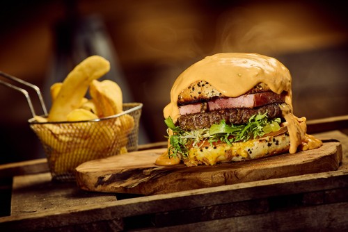 Bœuf, lard, cheddar, sauce secrète, salade, oignons frits, fromage des Alpes, Pickles, tomates et gouttes de pluie rouge.26,00€
