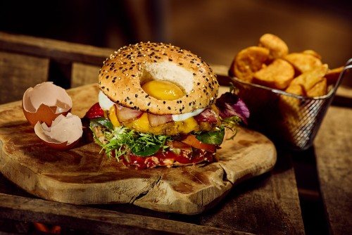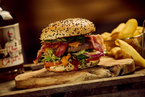 Bœuf, salade, cheddar, lard, œuf sur le plat, tomates, oignons frits, cornichons et ketchup.18,50€