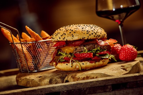 Boeuf aux fromages, confit de fraises, salade, tomates, lard, sauce secrète et fraises.22,50€