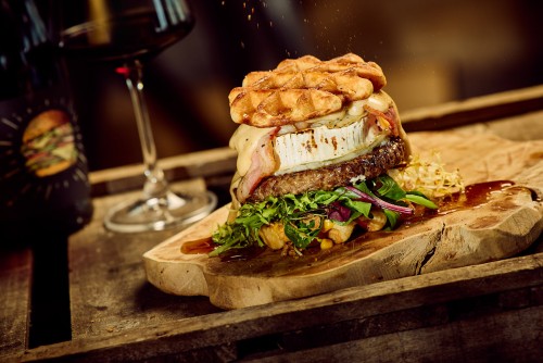 Gaufre de Liège, boeuf, cognac, salade, lard, fromage de chèvre et sirop d'érable.22,50€