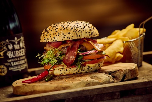 Bœuf, chili con carne maison ( haricots rouges – maïs - poivrons – haché ), lard et cheddar.19,50€