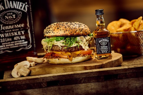Bœuf, salade, tomates, sauce champignons crème, double cheddar, oignons frits, miel, Jack Daniel’s.22,50€