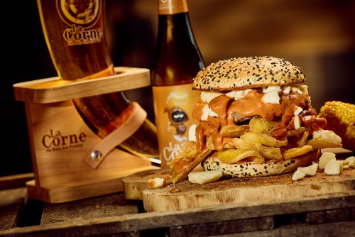 Bœuf, salade, cheddar, lard, mayo, sauce Liégeoise, oignons rouges et son shot de peket !18,50€
